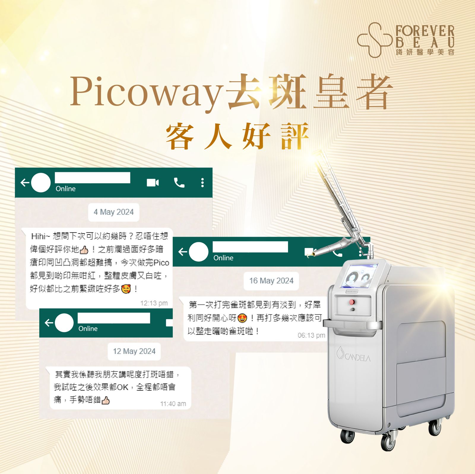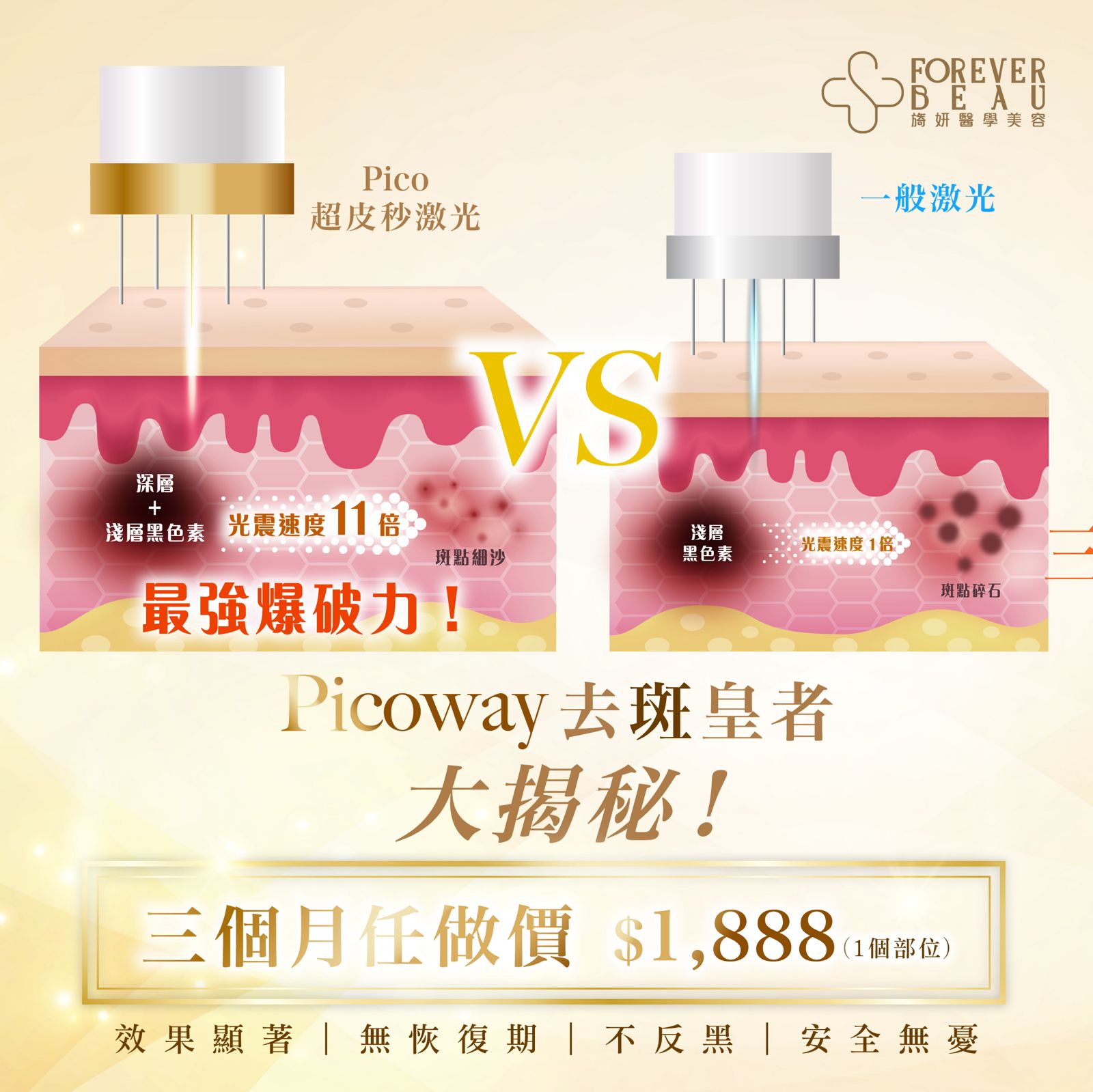 客戶在首次療程後便能明顯感受到肌膚變化,隨著新陳代謝,黑色素逐步排出,效果持續顯著。 - 不會反黑: