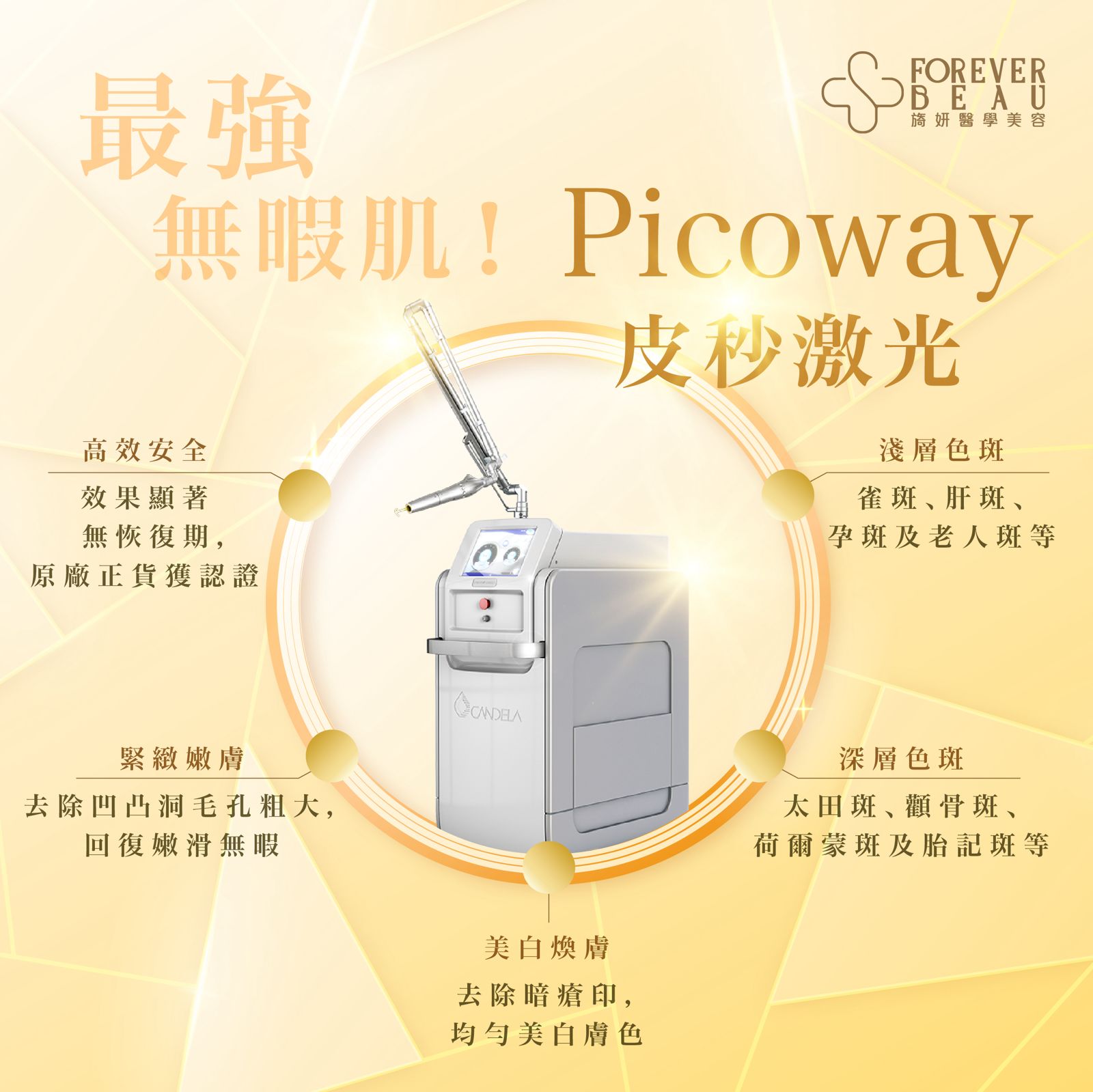 - PicoWay已獲得美國FDA及歐盟CE雙重認證,療程專注於黑色素問題,不會損傷周圍的健康肌膚,確保療程的安全性和有效性。
